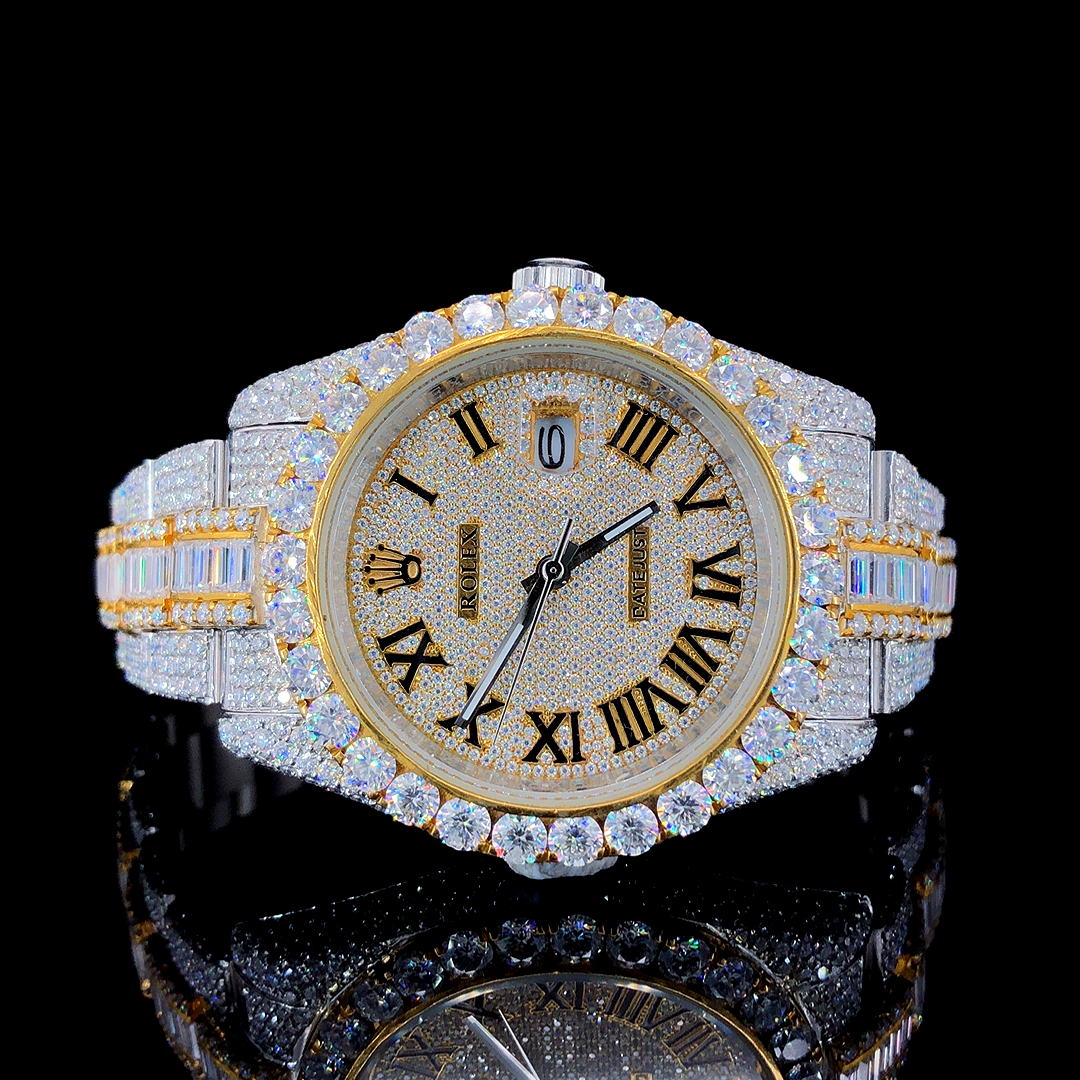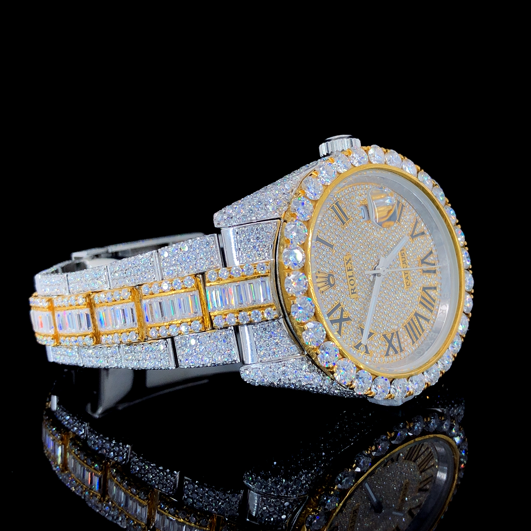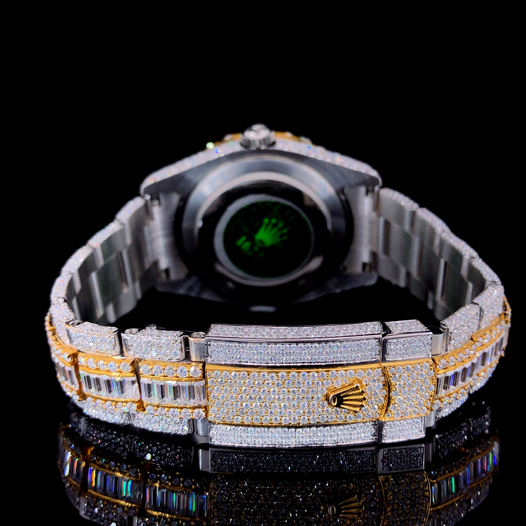 ROLEXX DATEONLY GOLDEN VVS1 ICED OUT STAINLESS STEEL ROUND & BAGUETTE DIAMOND WATCH—AUTOMATIC TIMEPIECE FOR MEN